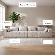 The boneless construction eliminates metal frames, wood joints, and mechanical elements entirely. Each module connects flush to the next, creating a seamless sofa surface that maintains its shape through daily use. The suede finish performance fabric is OEKO-TEX® Standard 100 certified and meets California TB117-2013 flammability standards.
